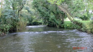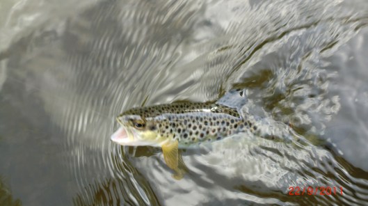 The water had a tint to it, after rains of a day or so past, but this is a good thing for anglers, and the wind, light as it was, was upstream, so if the dry was to be tied…! The trees lining the river all the way down, provided a canopy which offered the careful cast, opportunity, but the careless one, a tangle.