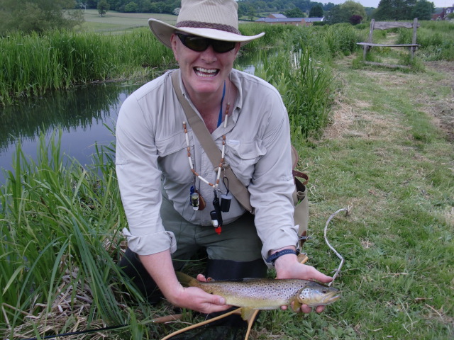 But it must have been Steve’s (negative) influence, for when he had to leave for his ‘baby sitting’ duties, and Paul came back downstream for a chat, that things changed. A rise, a cast, and a missed fish, albeit to the ‘infallible’, and then my first fish, and a second…and just above a groin we both saw a fish move. Casting to him was obviously going to be difficult, because the rush of water through the middle of the construction left little chance for a reasonable presentation. But…the ‘fella’ was feeding, and in the short moment before the drag would kill any prospect of a take…he did. WW3 broke out…he went angrily upstream, then turned and rushed downstream through the middle of the angled groin and into flowing water which made the tussle more interesting. But net him we did, and he turned out to be a super fish of 2lb+ and whilst there were several more that evening, to catch a wild fish of that beauty was so memorable, and in such a special river *.